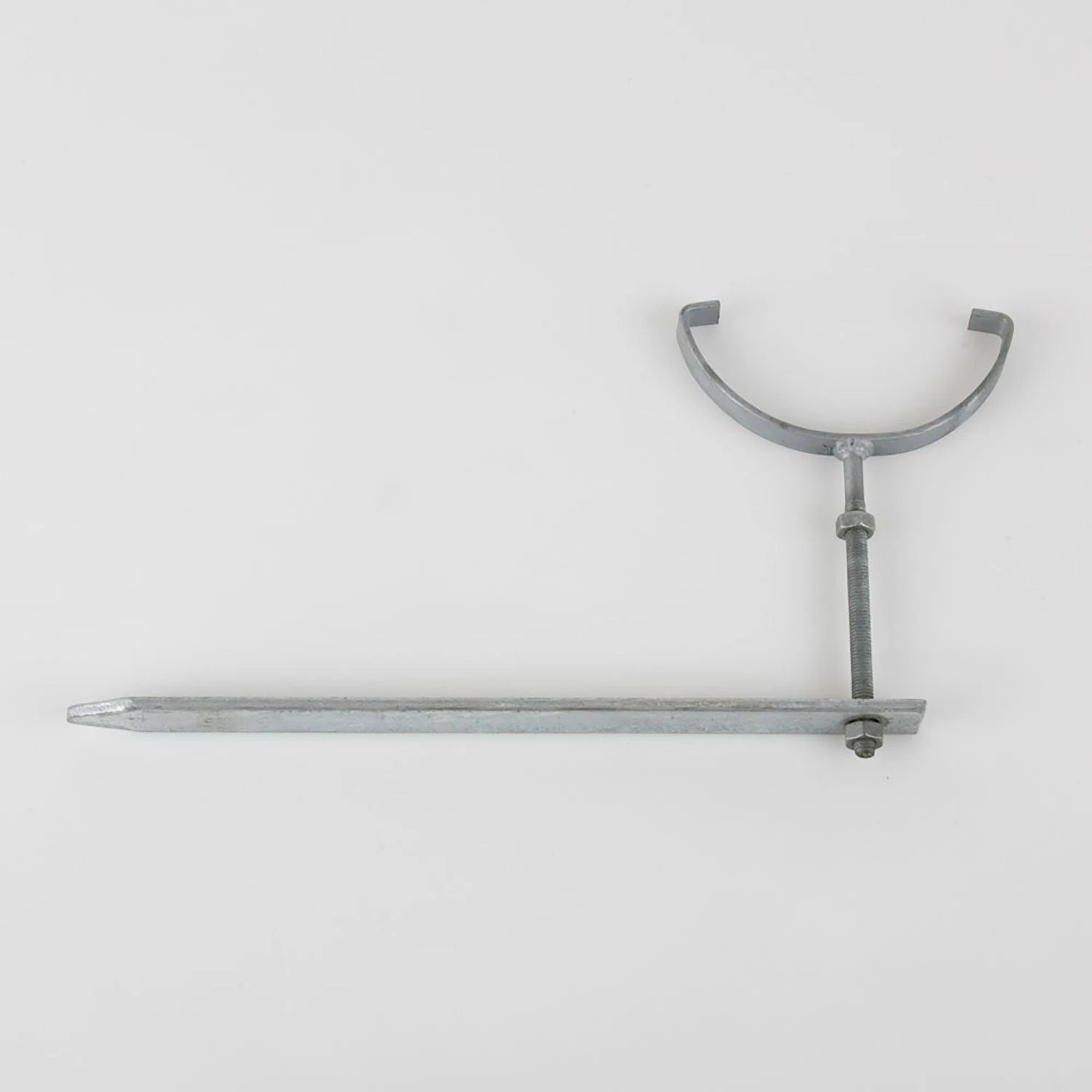 Gutter Rise and fall bracket galv with drive in spike. Allows adjustment of nuts to regulate final height of gutter to create desired fall. Galv Finish