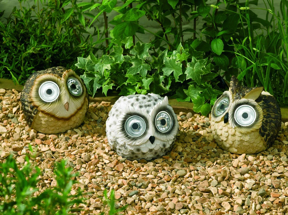 Product Details:- Spotlight eyes automatically illuminate in darkness- Charges in direct sunlight – Up to 8 hours of light each night when fully charged- Powered by an integral solar panel- On/Off switch to control light- 2 white LEDs per owl- No operating costs- Replaceable rechargeable batteries- No wiring, simply place and enjoy