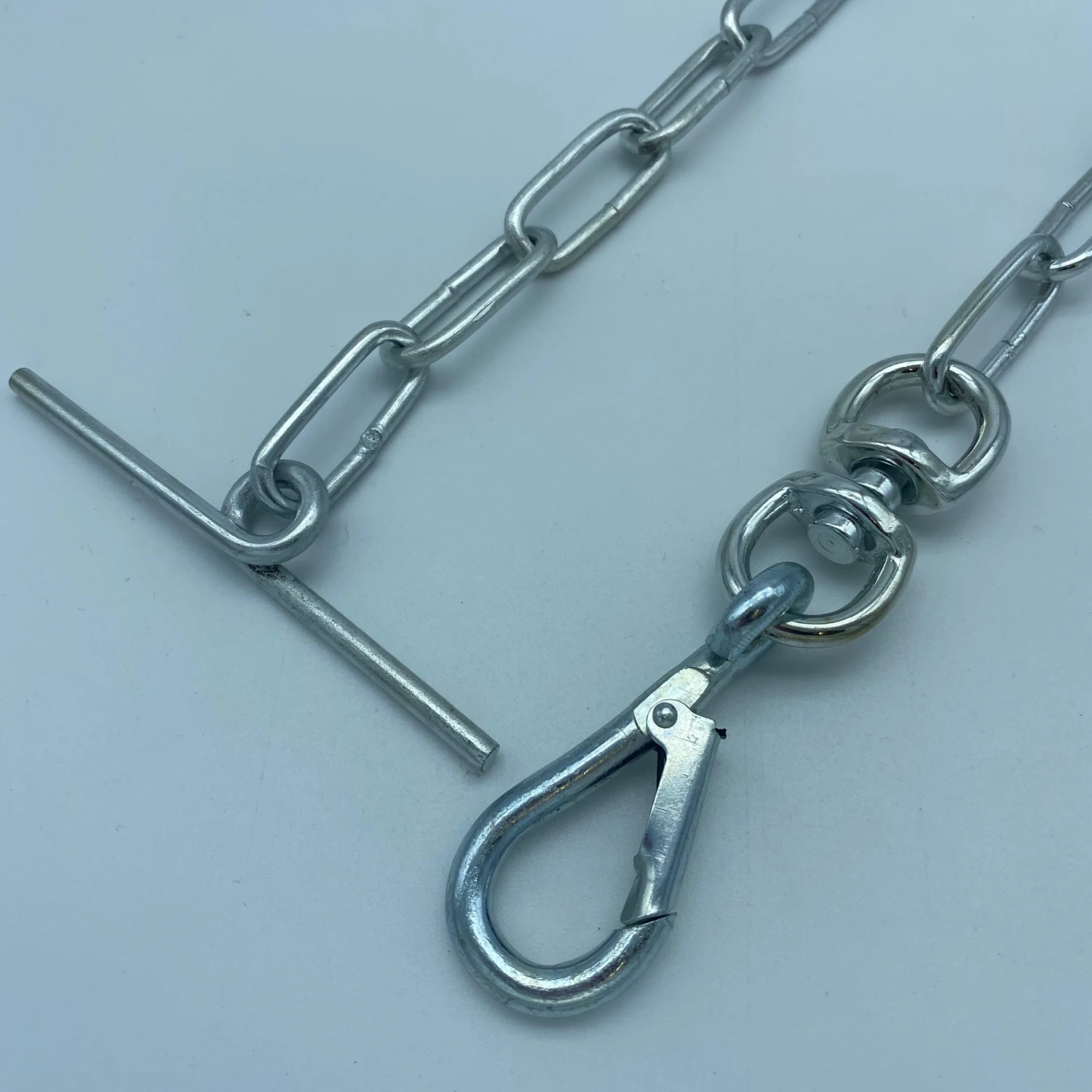 - Made from steel and Zinc plated this chain comes with a hook and t-bar to tie out your pet.